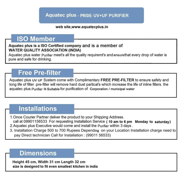 Aquatec plus is one of the leading supplier of water purifiers to the customers.We supply all kinds of water purifiers which are domestic and commercial water purifiers.We have been able to achieve 100% customer satisfaction through our professional and on time service. You can vist our web site , www.aquatecplus.in These water purifiers provide the best services to the clients, as they are completely tested on all quality. Can be used up to 200 TDS. UV UF Water Purifier Does not reduce TDS – Retains Minerals. Save up to 99% water – No rejection of water unlike RO Water Purifiers. Suitable for purification of corporation / municipal water